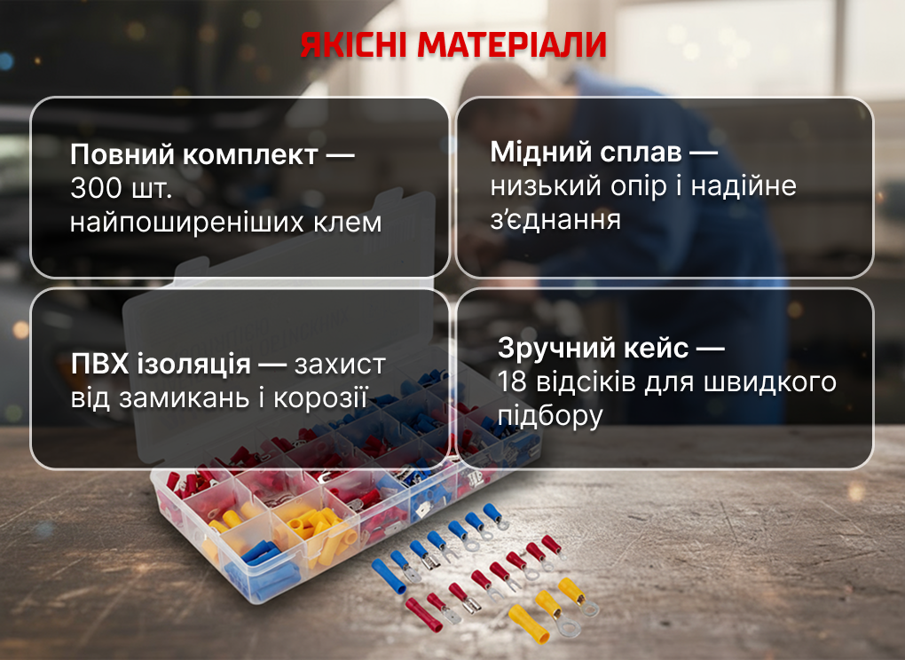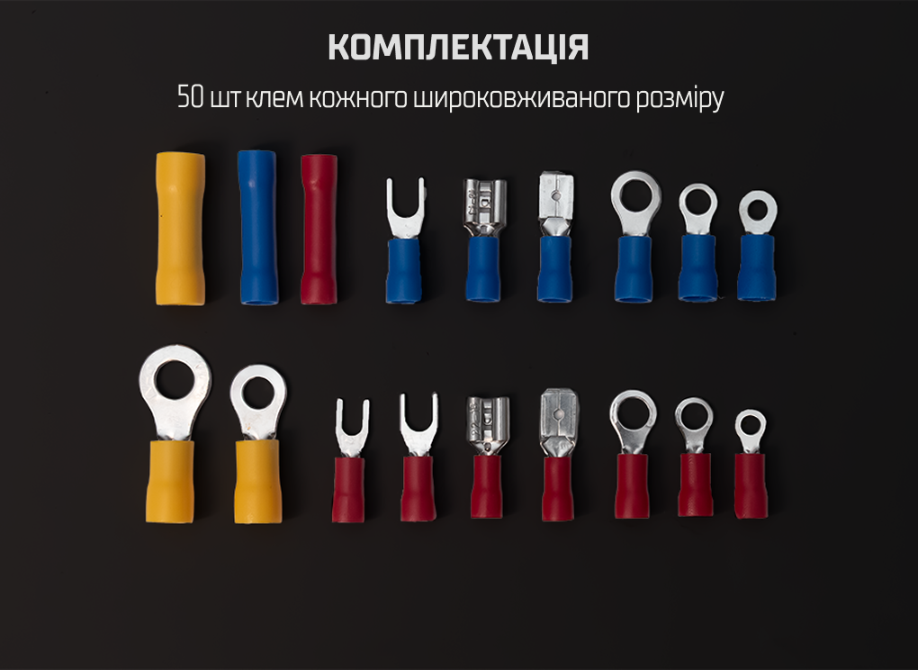 Комплектація охоплює всі основні типи клем, необхідні для ремонту і монтажу.