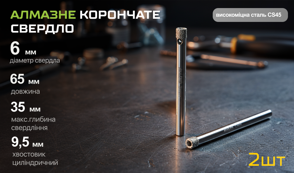 Alloid Base Ø6 мм (2 шт) — це професійні алмазні корончаті свердла, створені для точного та акуратного свердління найтвердіших матеріалів: скла, плитки, порцеляни, мармуру, граніту й кераміки. Робоча частина з алмазним напиленням D46 забезпечує чистий, рівний отвір без сколів і тріщин навіть на крихких поверхнях. Рекомендоване свердління на низьких обертах із охолодженням водою для збереження ресурсу інструмента.