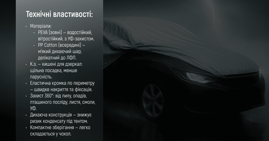 Багатошаровий всесезонний тент для стоянки під відкритим небом і в гаражі. Зовнішній шар PEVA захищає від дощу/снігу та УФ, підкладка з PP Cotton (спанбонду) м’яко контактує з лакофарбовим покриттям і запобігає мікроподряпинам. Сірий колір менше нагрівається на сонці, бруд менш помітний.