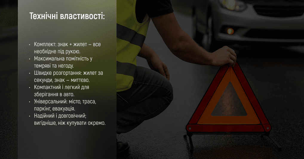 Даний набір включає в себе обов'язкові атрибути для будь-якого відповідального водія - знак аварійної зупинки і жилет безпеки, які зроблять Ваше перебування на дорозі помітним.