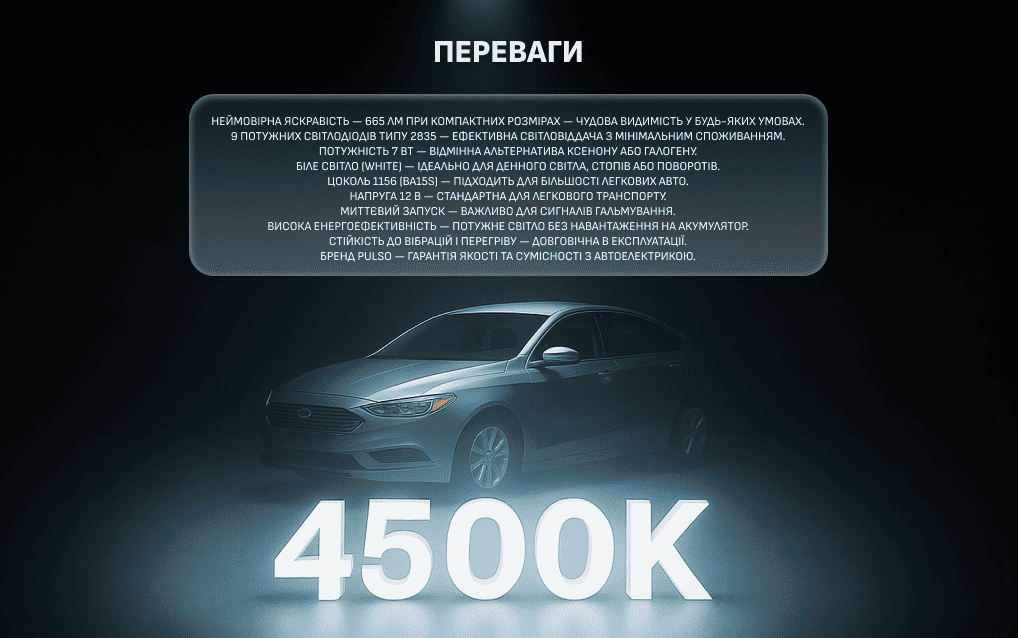 Лампа PULSO LED 1156 із дев’ятьма діодами SMD-2835 забезпечує високу яскравість і рівномірне холодне біле світло. Вона ідеально підходить для використання у стоп-сигналах, габаритах або інших автомобільних світлових пристроях із цоколем BA15s.