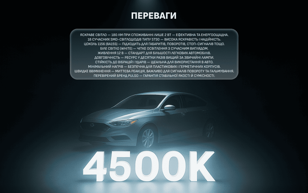 Світлодіодна лампа PULSO LED 1156 із 18 діодами SMD-5730 забезпечує яскраве холодне біле світло та рівномірне освітлення. Ідеально підходить для використання в стоп-сигналах, габаритах або інших автомобільних освітлювальних системах із цоколем BA15s.