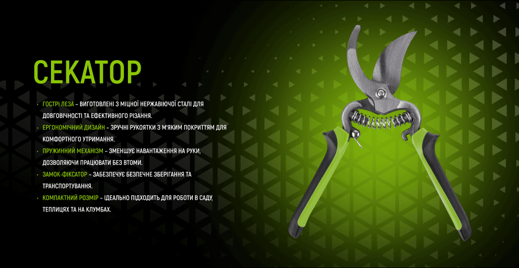 - Особливості: легкий, ергономічний, забезпечує чистий зріз без пошкодження рослин