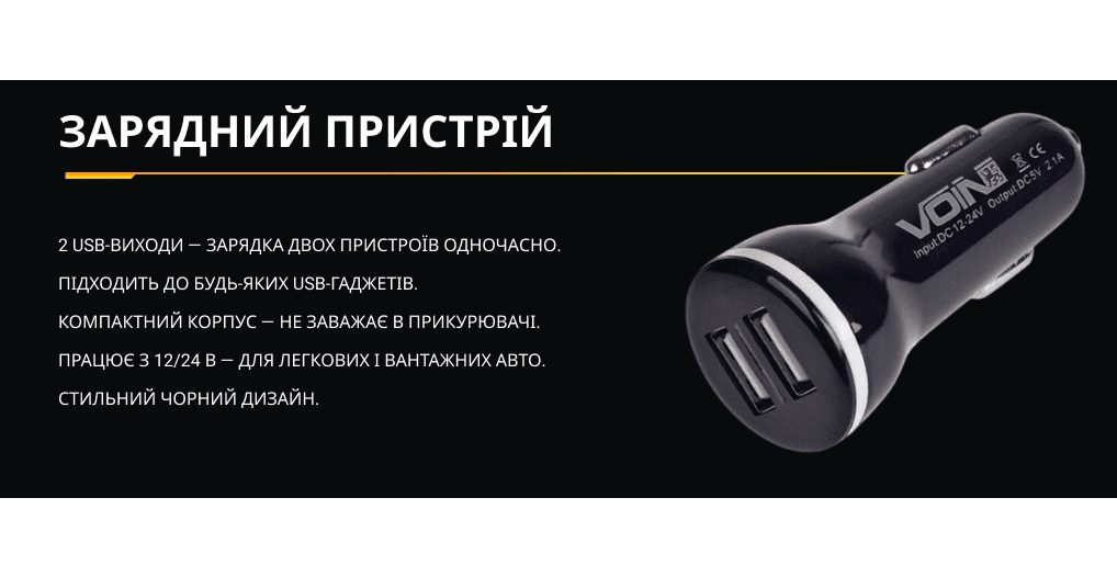Автомобільний зарядний пристрій VOIN C-2023BK 2USB (12 / 24V - 5V 2,1A) та інші товари ви можете придбати ОПТом та в РОЗДРІБ і замовити доставку по всій Україні у нашому інтернет-магазині аксесуарів та інструменту для автомобіля vitol.com.ua.