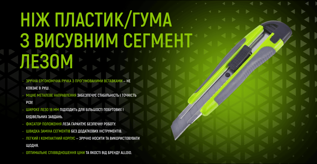 Ніж пластик/гума з висувним сегмент лезом 18мм Alloid та інші товари ви можете придбати ОПТом та в РОЗДРІБ і замовити доставку по всій Україні у нашому інтернет-магазині аксесуарів та інструменту для автомобіля vitol.com.ua.