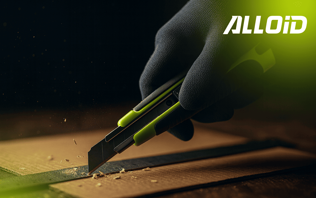 Ніж Alloid з висувним сегментним лезом 18 мм — зручний інструмент для побутового, ремонтного та професійного використання. Корпус виготовлено з поєднання пластику та гуми, що забезпечує ергономічне та неслизьке захоплення під час роботи. Міцне металеве направляюче лезо фіксується в кількох положеннях, що дозволяє точно регулювати довжину ріжучої частини. Ідеально підходить для різання картону, плівки, шпалер, пластику та інших матеріалів.