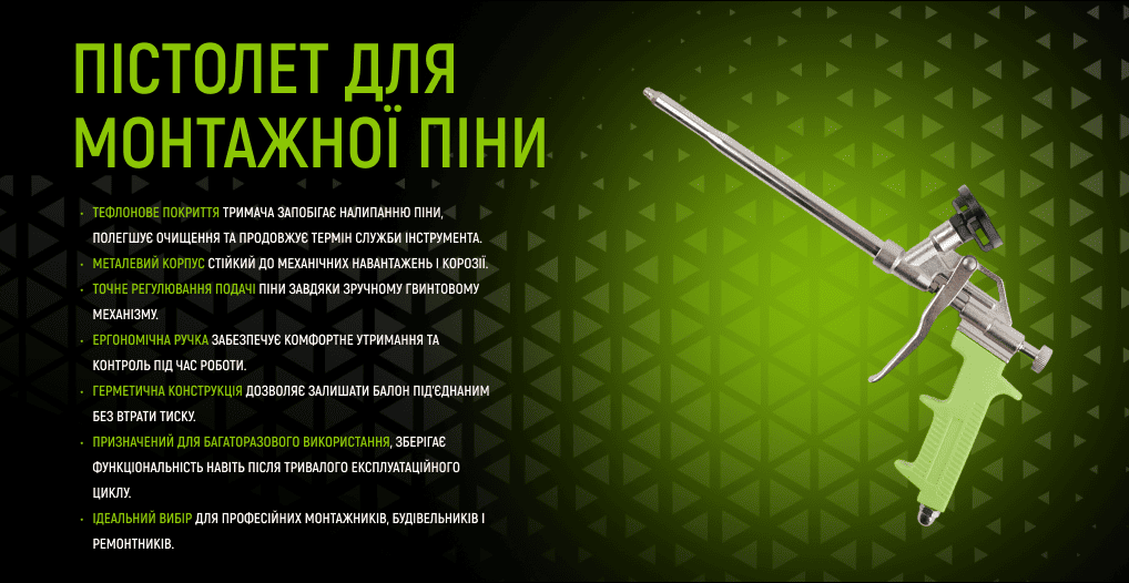 - Призначений для точного дозування та нанесення поліуретанової монтажної піни з професійних балонів.