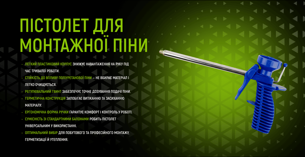 - Призначений для точного дозування та нанесення поліуретанової монтажної піни з професійних балонів.