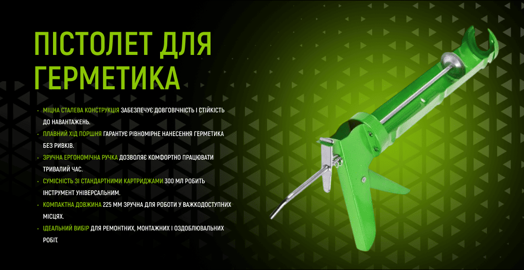 - Призначений для нанесення герметиків, силікону, клеїв та акрилових складів у стандартних картриджах 300 мл.