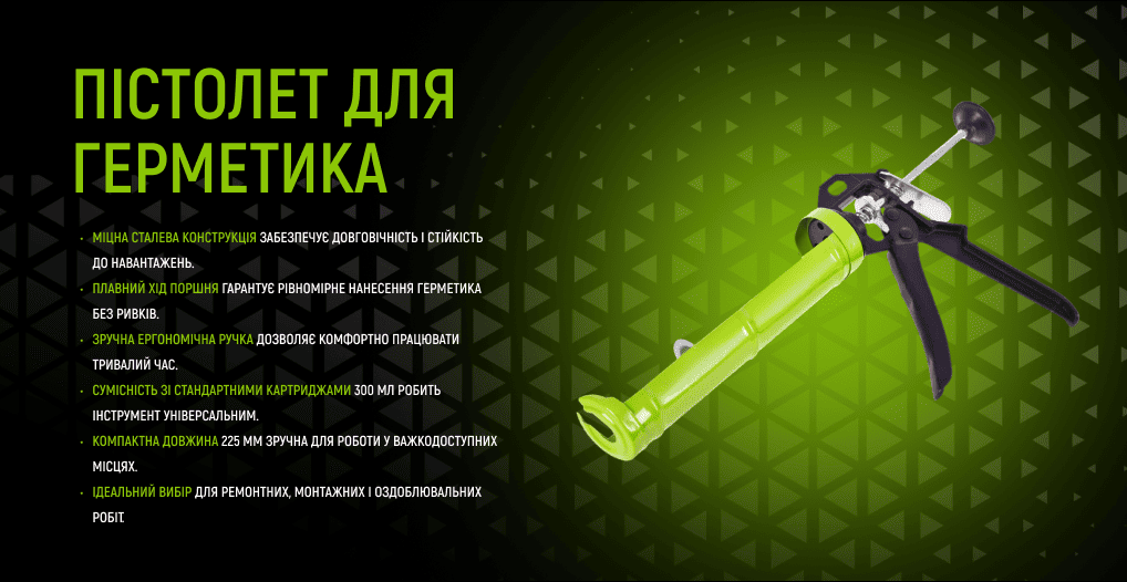 - Призначений для нанесення герметиків, силікону, клеїв та акрилових складів у стандартних картриджах 300 мл.